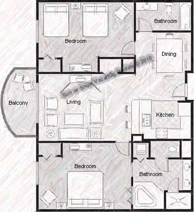 1,219-1,310 square feet, one king bed, two double beds, one queen sleeper sofa, two full baths with a whirlpool tub in master bath, full kitchen, living area, dining area, balcony/deck. Maximum occupancy is 8.